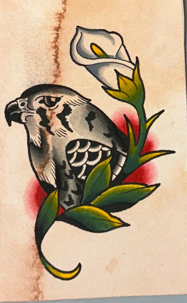 Sure the staining on this paper went right through his face, but I just think it makes him look tougher. At least as tough as a kestrel with a Cala Lily can look.